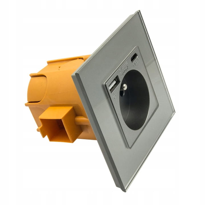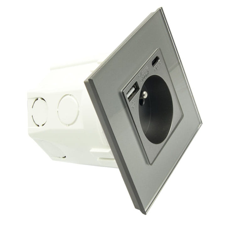 Gniazdo elektryczne z uziemieniem oraz zabezpieczeniem torów prądowych przed dziećmi.Efektowne gniazdo elektryczne charakteryzujące się bardzo szybkim ładowanie Quick Charge wyposażone w dwa porty USB typu A oraz C. Gniazdo w komplecie ze szklanym panelem. Gniazdko idealnie pasuje do innych naszych produktów z serii B-Line, jak włączniki dotykowe, mechaniczne itp.