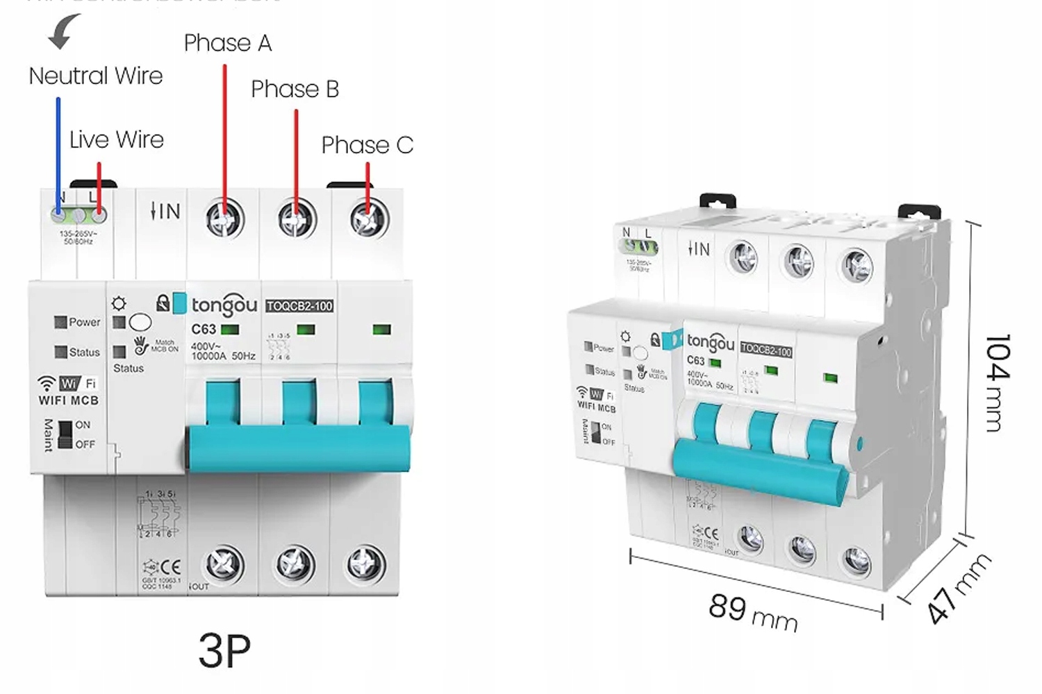 Inteligentny bezpiecznik WiFi C63 do instalacji trójfazowej z licznikiem energii elektrycznej i funkcjami zabezpieczającymi do aplikacji Tuya i Smart Life