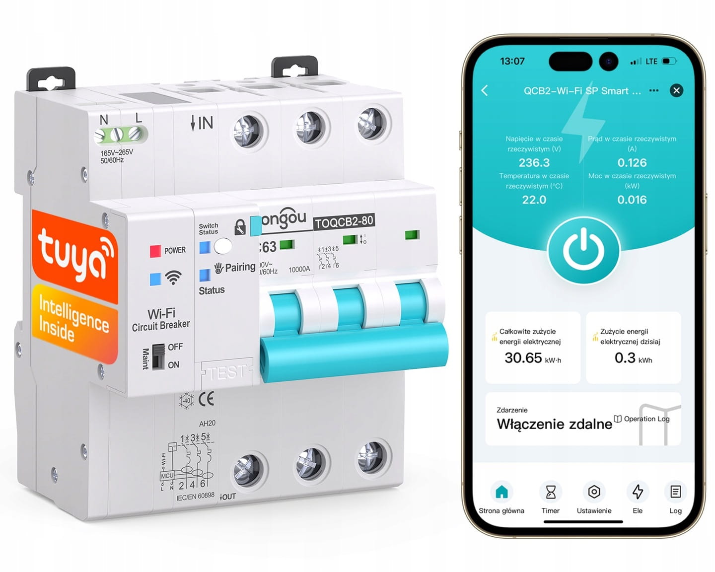 Bezpiecznik nadprądowy 3-fazowy 3P C63 przekaźnik WiFi TUYA pomiar prądu