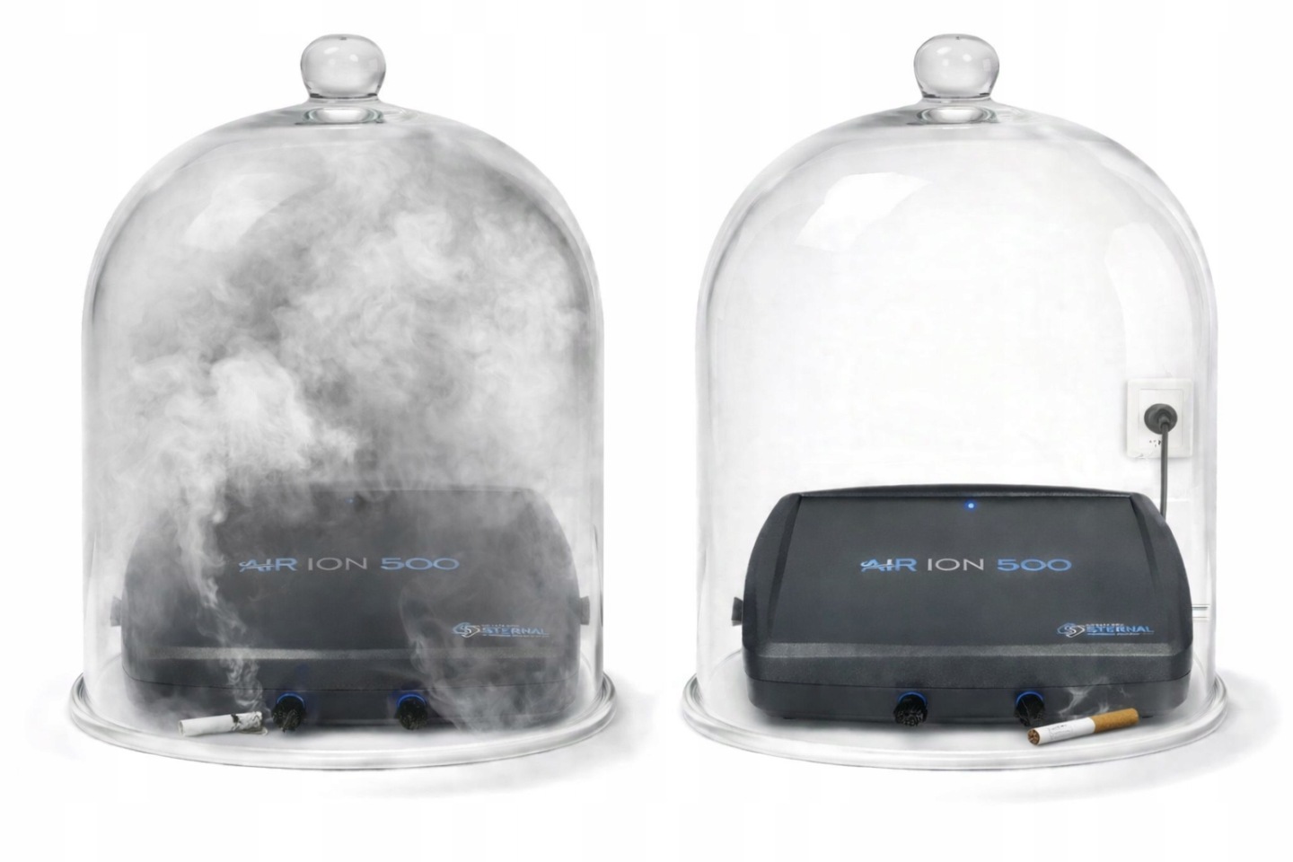 W drugiej kopule jonizator AIR ION 500 jest włączony – powietrze pozostaje czyste, ponieważ jony ujemne przyłączają się do cząstek zanieczyszczeń, powodując ich opadanie.