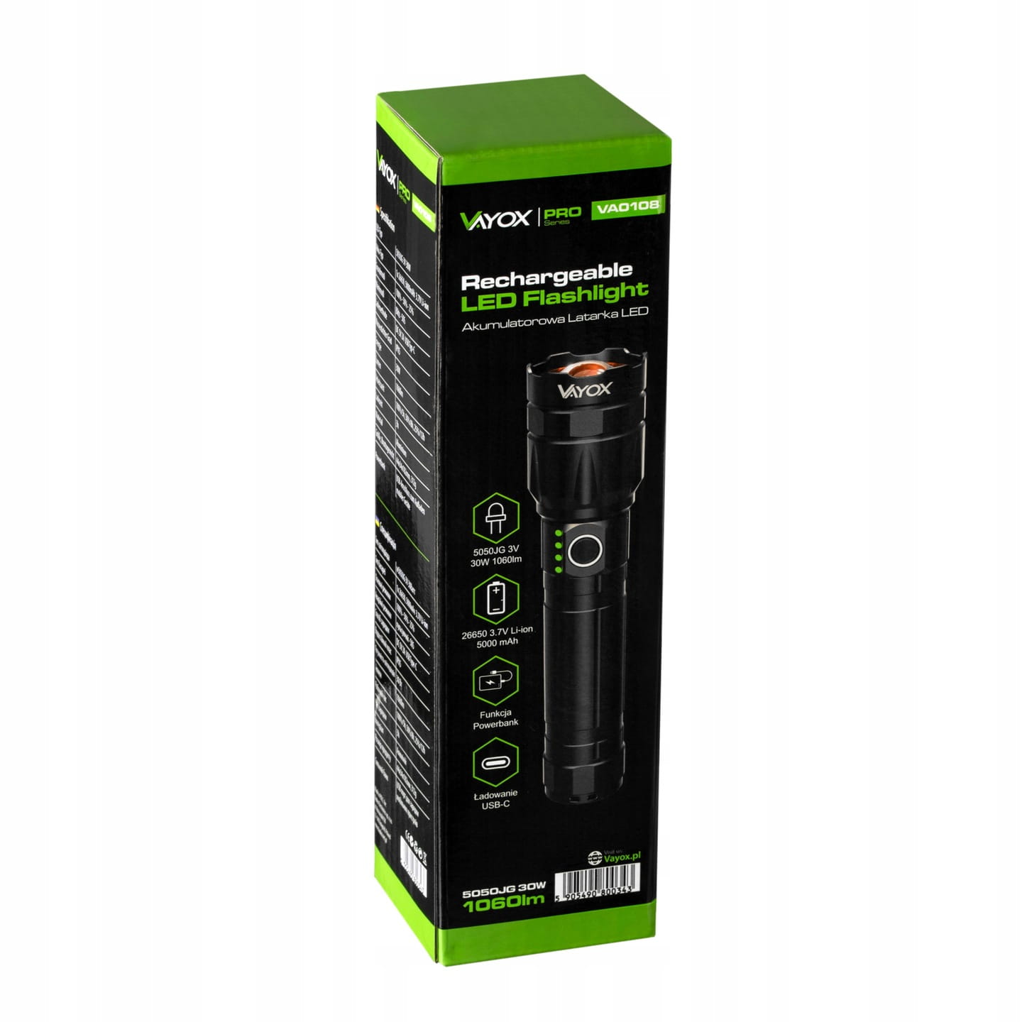 - W zestawie: akumulator 26650, pasek na rękę, kabel USB-C, latarka VA0108, oryginalne opakowanie