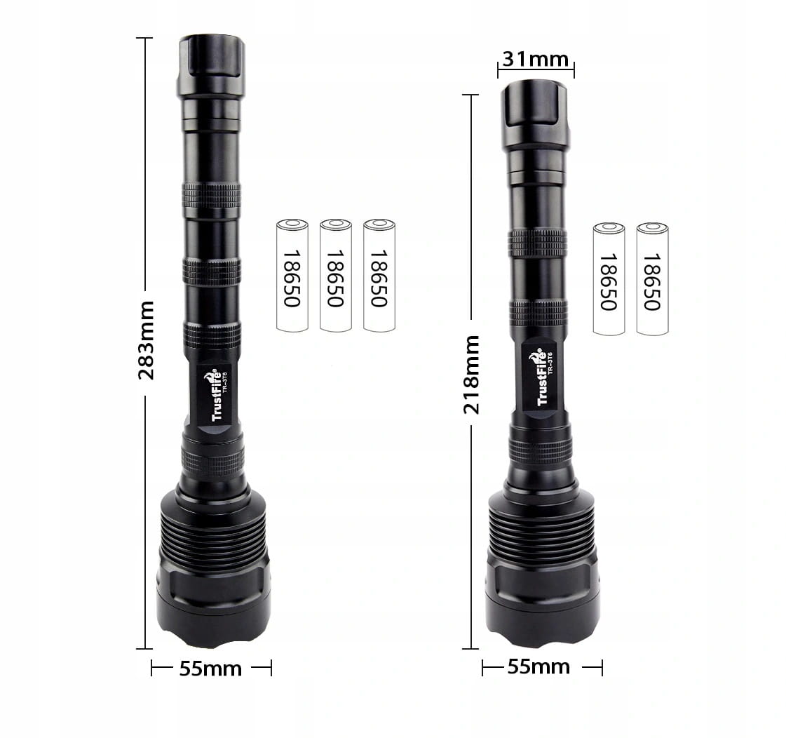 - W zestawie wysokiej jakości akumulatory 3x TrustFire 3400 mAh 18650 z zabezpieczeniem