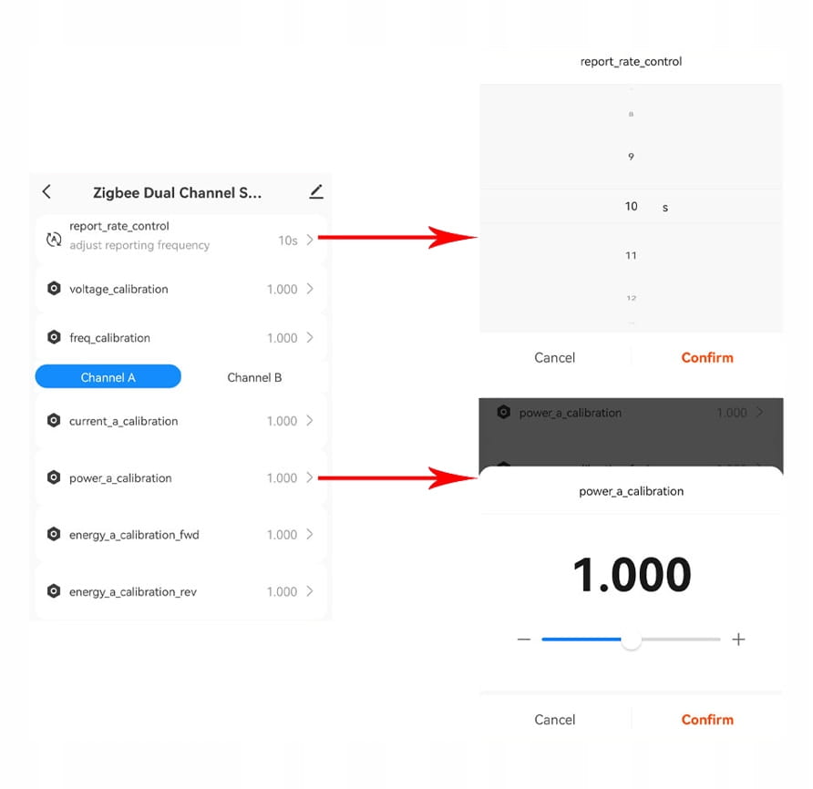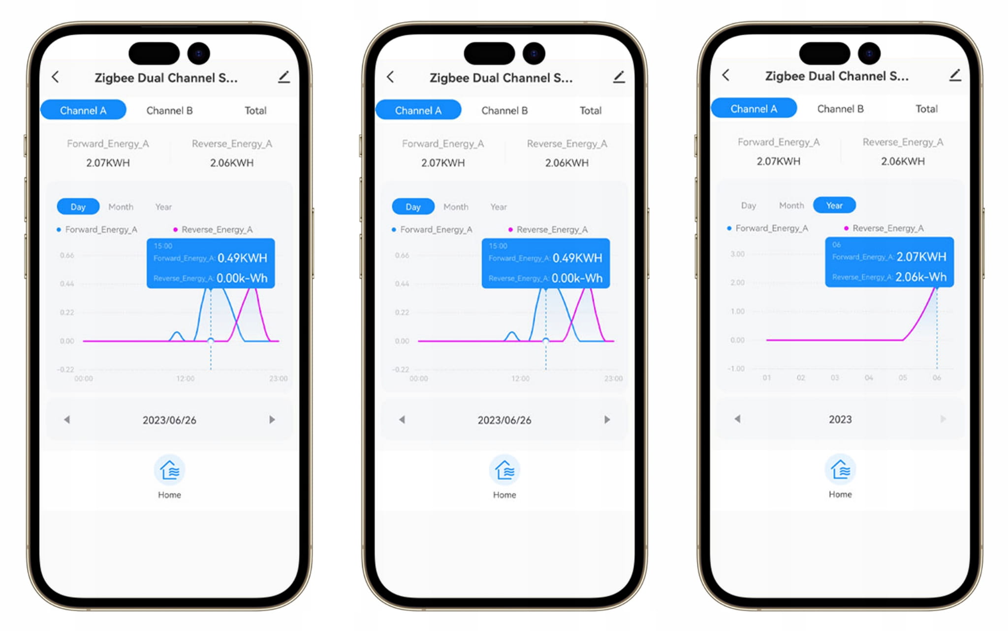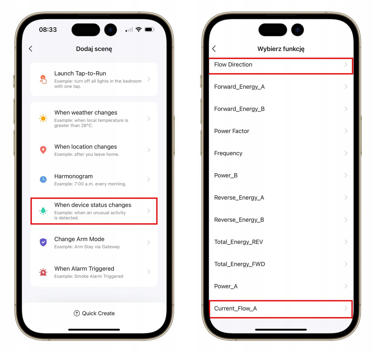 Istnieje możliwość ustawienia interakcji licznika z innymi urządzeniami w aplikacji Tuya w oparciu o kierunek przepływu prądu.