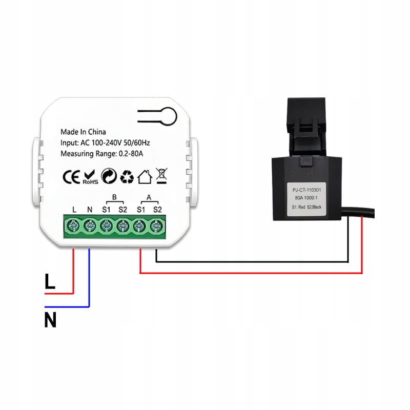 - Podłączenie przekładnika: S1 - czerwony, S2 - czarny