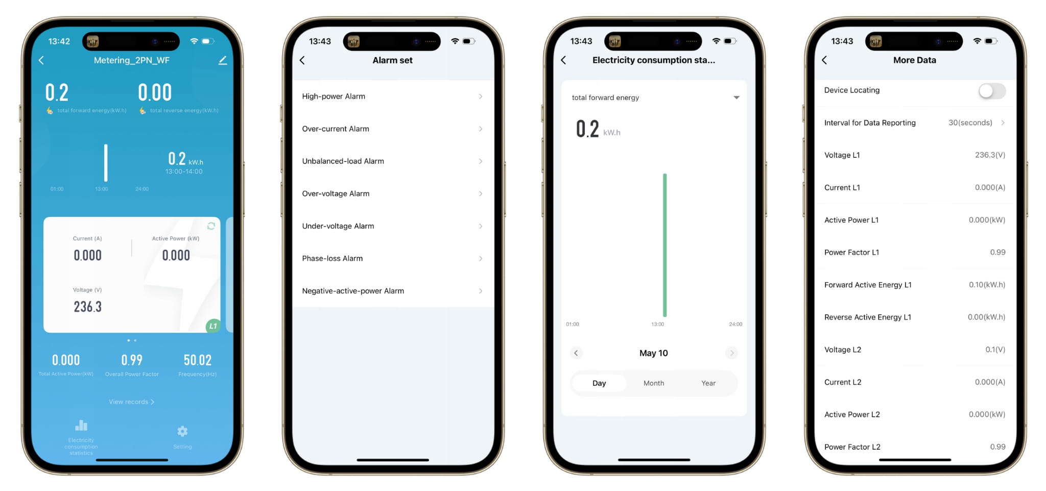 - Alarmy i powiadomienia - przed wzrostem napięcia, spadkiem napięcia, wzrostem prądu, wzrostem mocy powyżej zadanego poziomu, zmianą kierunku prądu (zużycie, produkcja), wykorzystaniem limitu zużycia energii, wzrostem temperatury licznika (ochrona przed przegrzaniem), informacja o zaniku jednej z faz