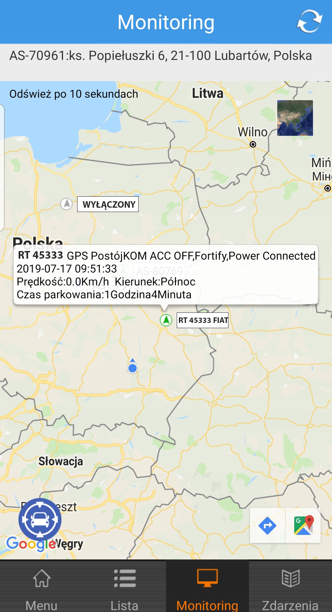 - Alarm, gdy dany pojazd oddali się od ustalonego miejsca o x metrów, bądź przekroczy ustaloną prędkość
