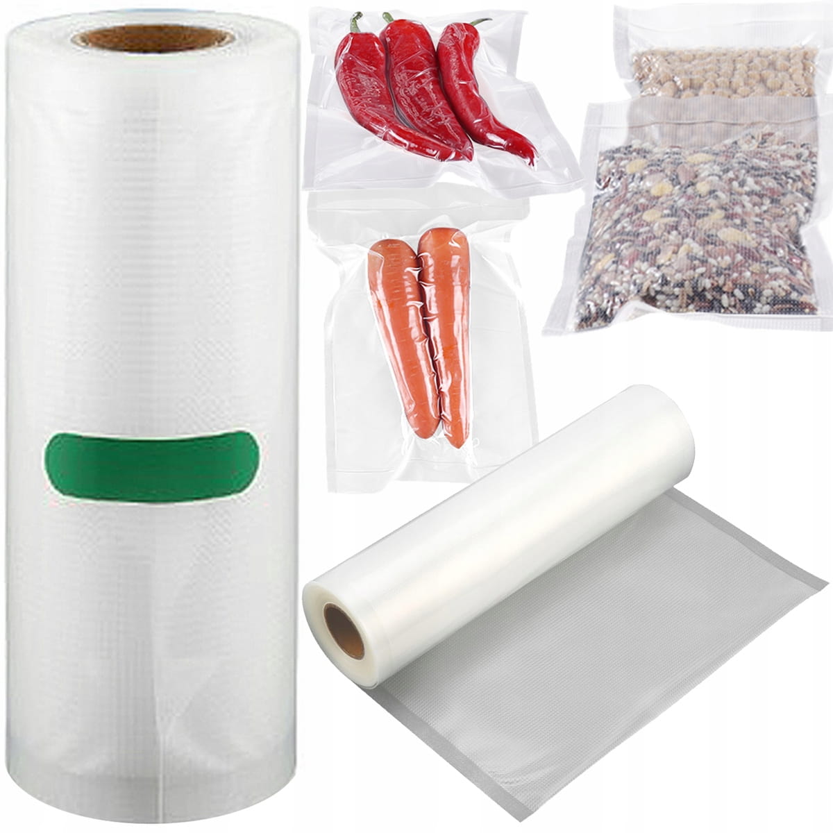 - Jedna strona z moletowanym kanałem i przezroczysta z drugiej, zapewnia mocne ssanie i zgrzewanie, chroni żywność przed przebiciem worka próżniowego.