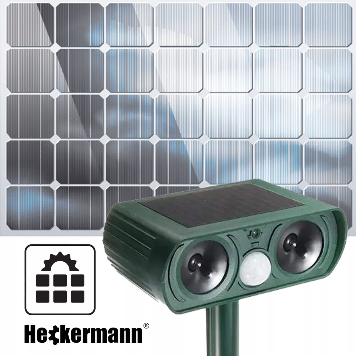 Panel słoneczny zamontowany na górze urządzenia przez cały dzień gromadzi energię z promieni słonecznych co zapewnia działanie odstraszacza. Dodatkowo jest odporny na różne warunki atmosferyczne. Można wbić go w ziemię, ale również posiada otwory do zamontowania na ścianę budynku.