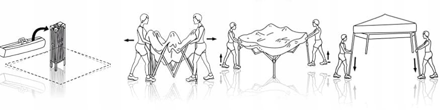 • Łatwy montaż i demontaż: Ilustracje pokazujące proces rozkładania pawilonu wskazują, że jest on prosty i szybki, co pozwala zaoszczędzić czas i wysiłek. Mechanizm składania pozwala na bezproblemowe złożenie pawilonu do kompaktowych rozmiarów.