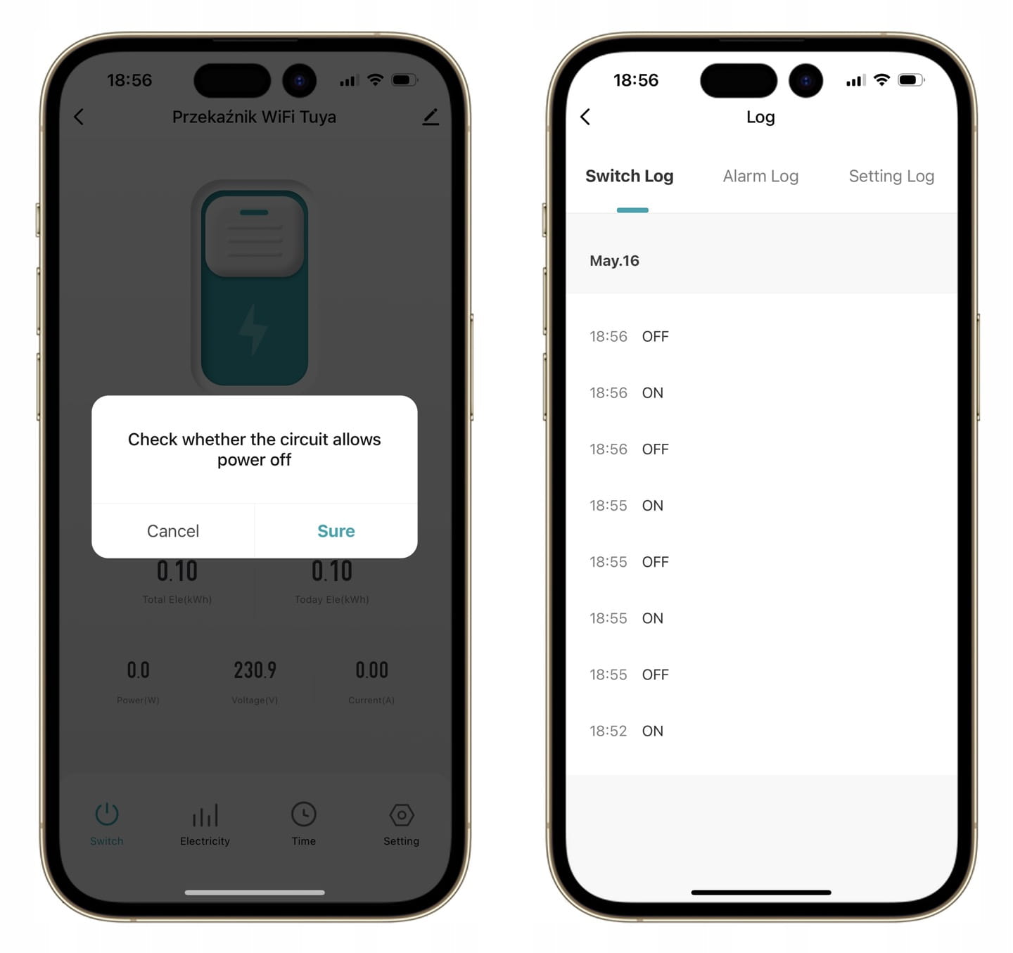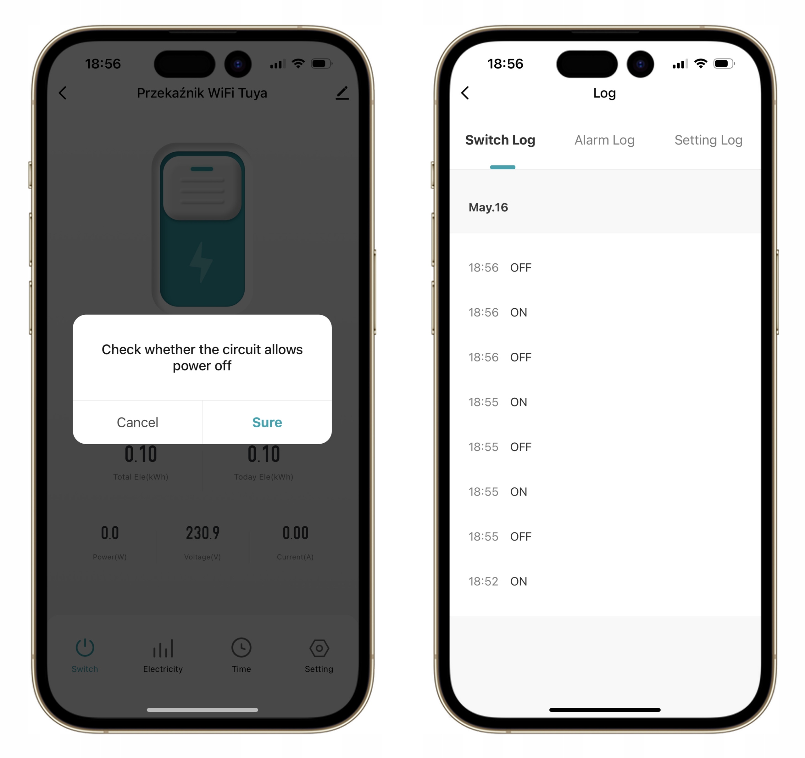 Przekaźnik posiada zabezpieczenie przed przypadkowym wyłączeniem w aplikacji. Po próbie wyłączenia przekaźnika w aplikacji pojawi się komunikat czy na pewno przekaźnik ma odłączyć zasilanie obwodu. Zapobiega to przypadkowemu odłączeniu od zasilania urządzeń lub obwodów elektrycznych.