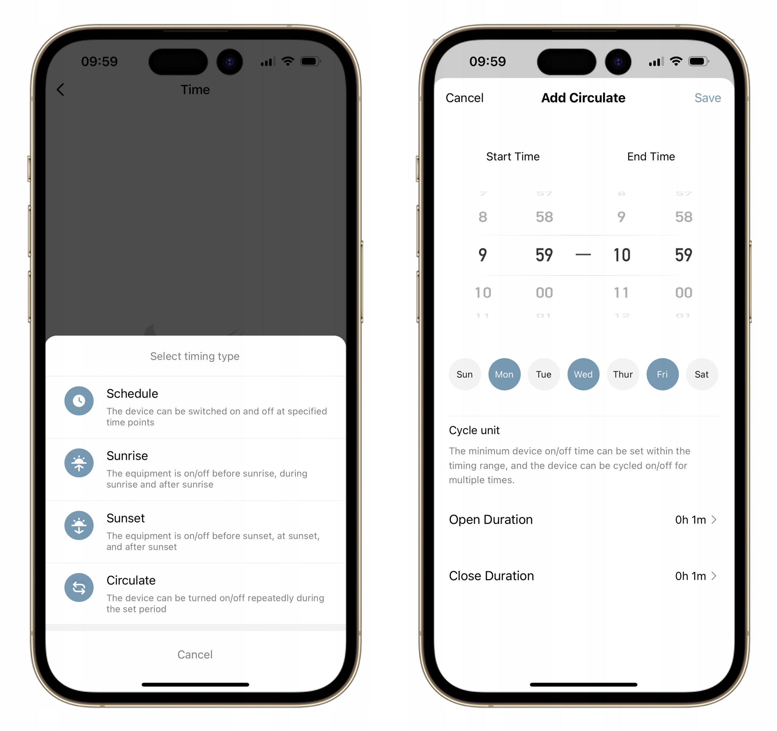 - Circulate - praca w pętli włącz / wyłącz. Na przykład: włączony przez 1 minutę, wyłączony przez 2 minuty - w ciągłej pętli, w określonych porach i dniach.