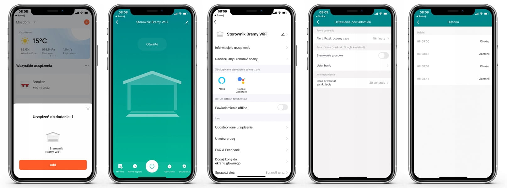 • Możliwość śledzenia historii zdarzeń oraz otrzymywania powiadomień o otwarciu bramy