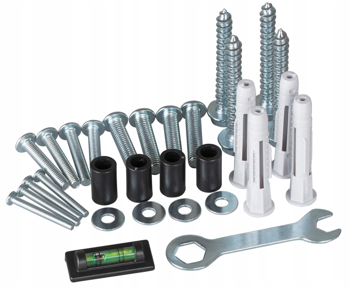 - W zestawie uniwersalny komplet śrub montażowych do telewizora oraz komplet wkrętów i kołków do ściany, poziomica