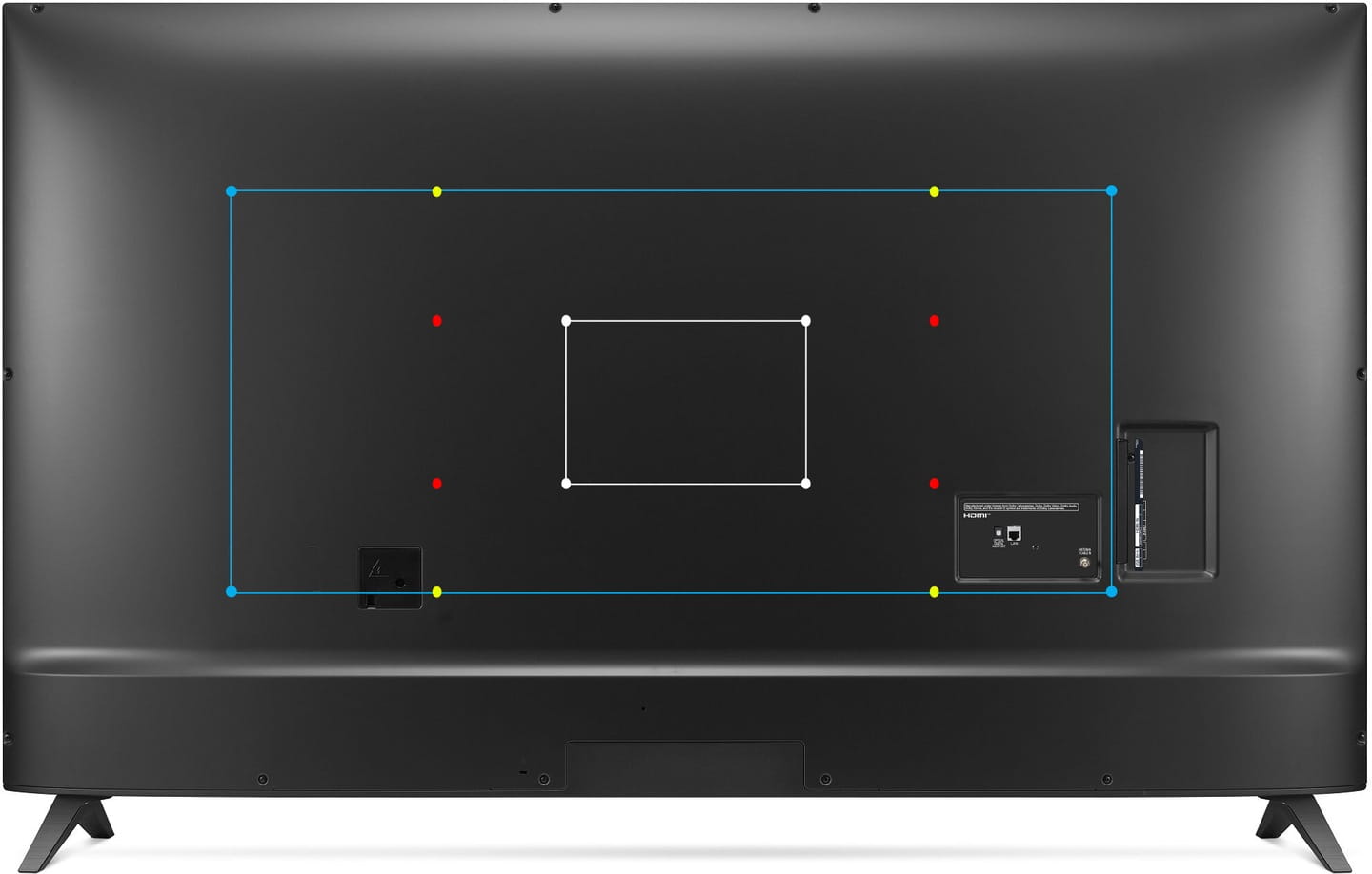 Aby dokładnie dopasować uchwyt do swojego telewizora należy zmierzyć odstępy pomiędzy otworami w poziomie oraz pionie - służą one do montażu szyn, które następnie podwieszone są na płycie czołowej zamontowanej na ścianie. Stworzona grafika prezentuje różne rozmiary w zależności od kolorów.