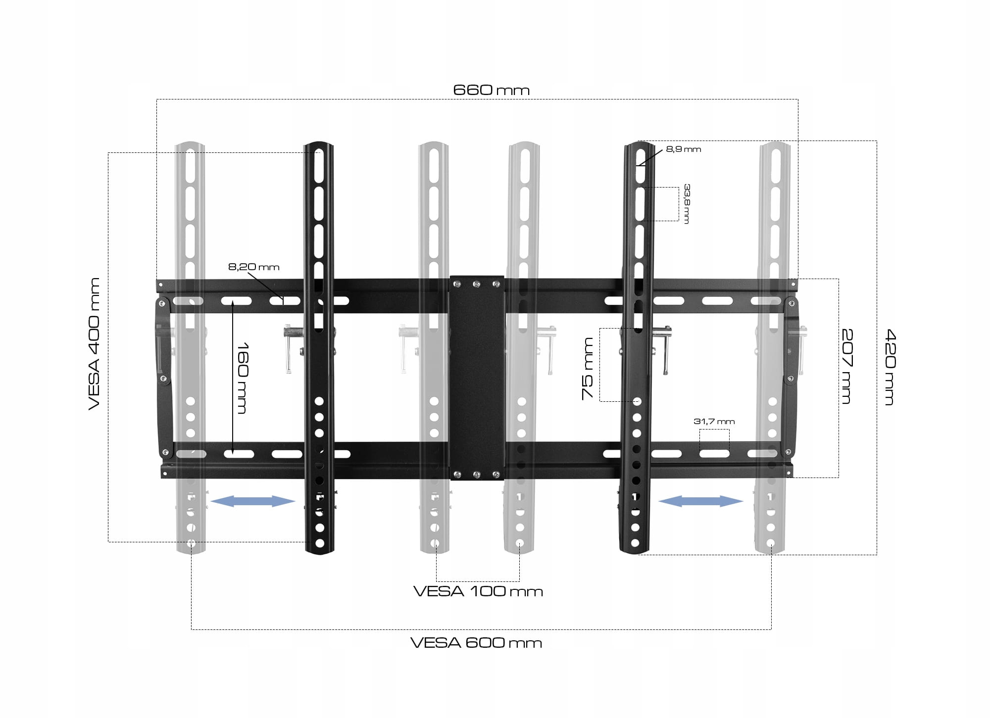 Prezentowany uchwyt jest niesamowicie mocny i uniwersalny - posiada on płynnie regulowany rozstaw otworów montażowych od 100 x 100 mm do aż 600 x 400 mm (pierwszą wartością jest odległość między otworami poziomymi, drugą wartością jest odległość między otworami pionowymi).