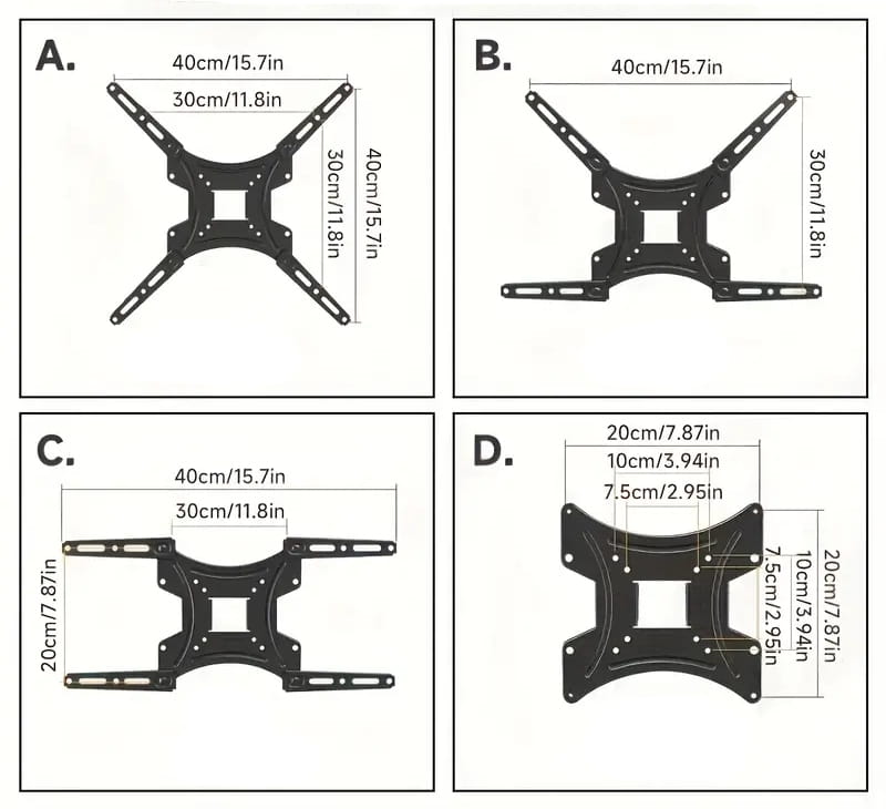 - Na zdjęciu poniżej przedstawiono przykładowe dostępne rozstawy otworów montażowych. Sprawdź kompatybilne wymiary w specyfikacji technicznej powyżej, aby upewnić się, że wybrany uchwyt będzie odpowiedni dla Twojego telewizora.