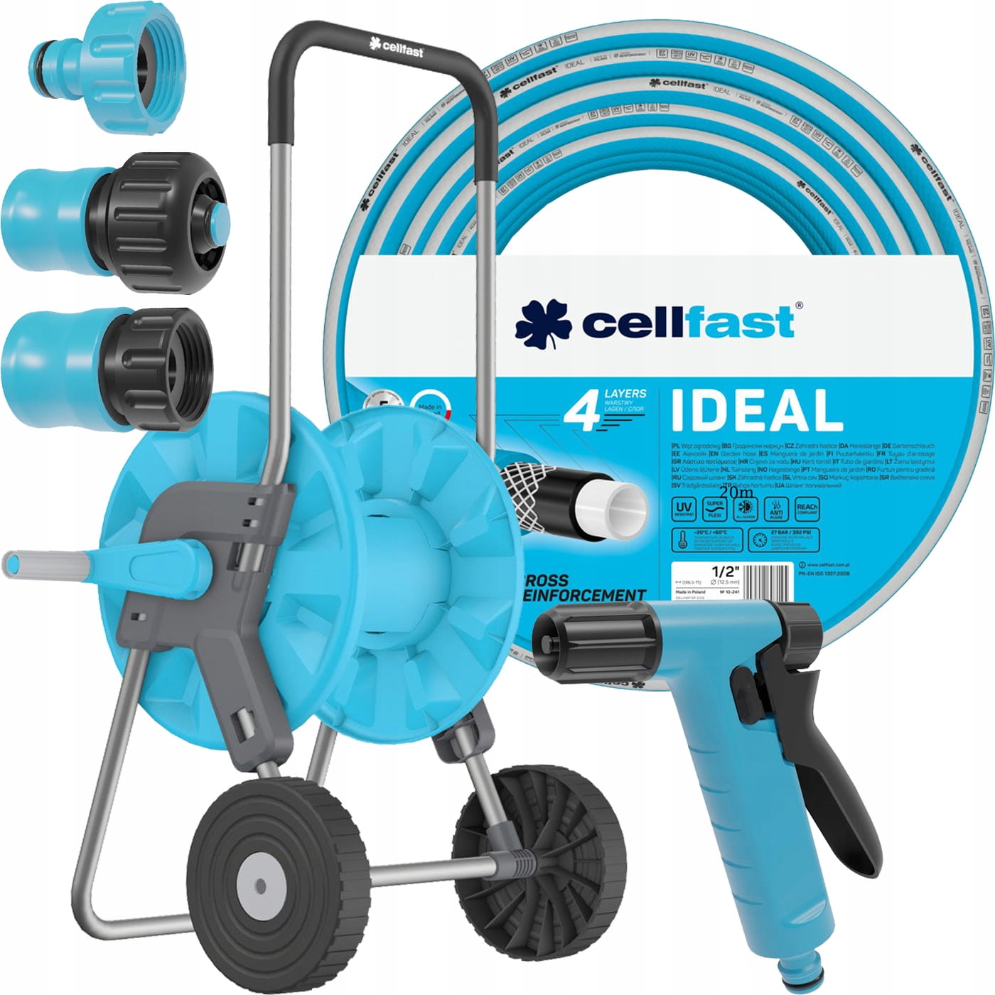 ZESTAW WÓZEK WĄŻ OGRODOWY 4WARSTWY ZBROJONY 1/2" 30M + ZRASZACZ 3X ZŁĄCZKI Marka Cellfast