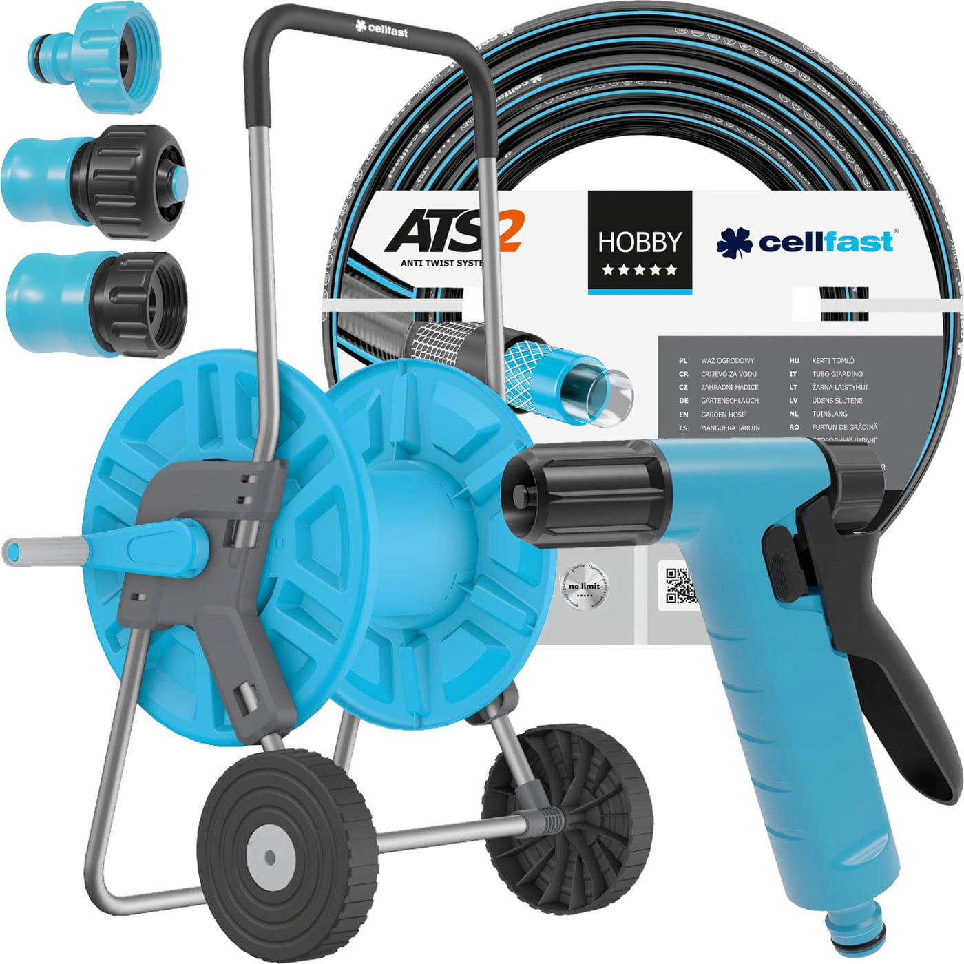 Zestaw Premium wózek + wąż ogrodowy zbrojony 1/2 50 m + zraszacz + 3x złączka Cellfast oryginalny