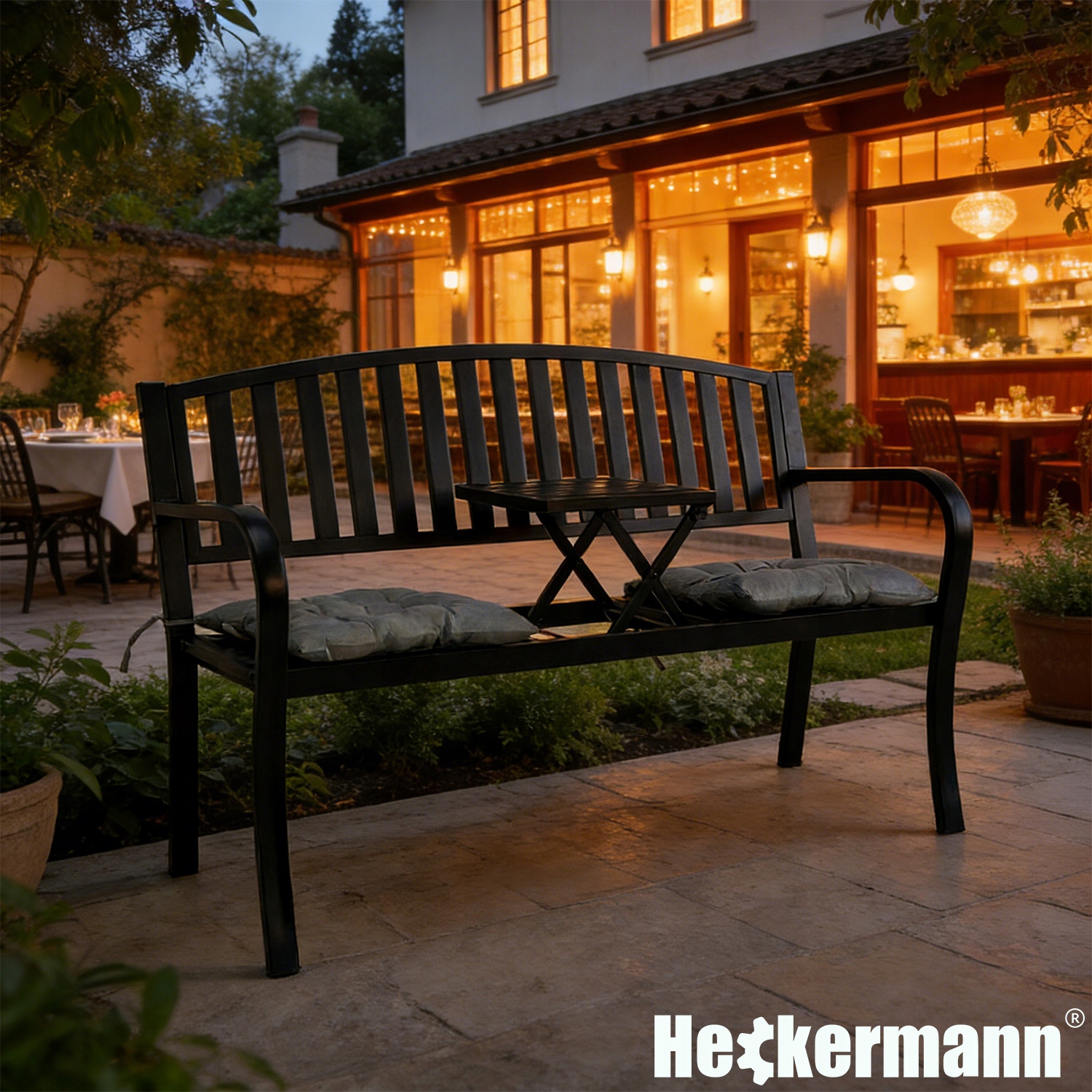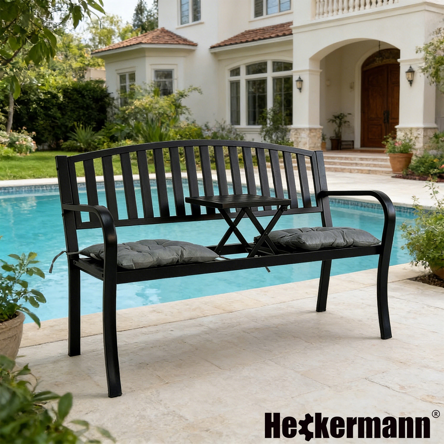 Ławka ogrodowa Heckermann z wysuwanym do góry stolikiem powstała właśnie po to, aby rozwiązać te codzienne, irytujące problemy – w prosty i elegancki sposób.