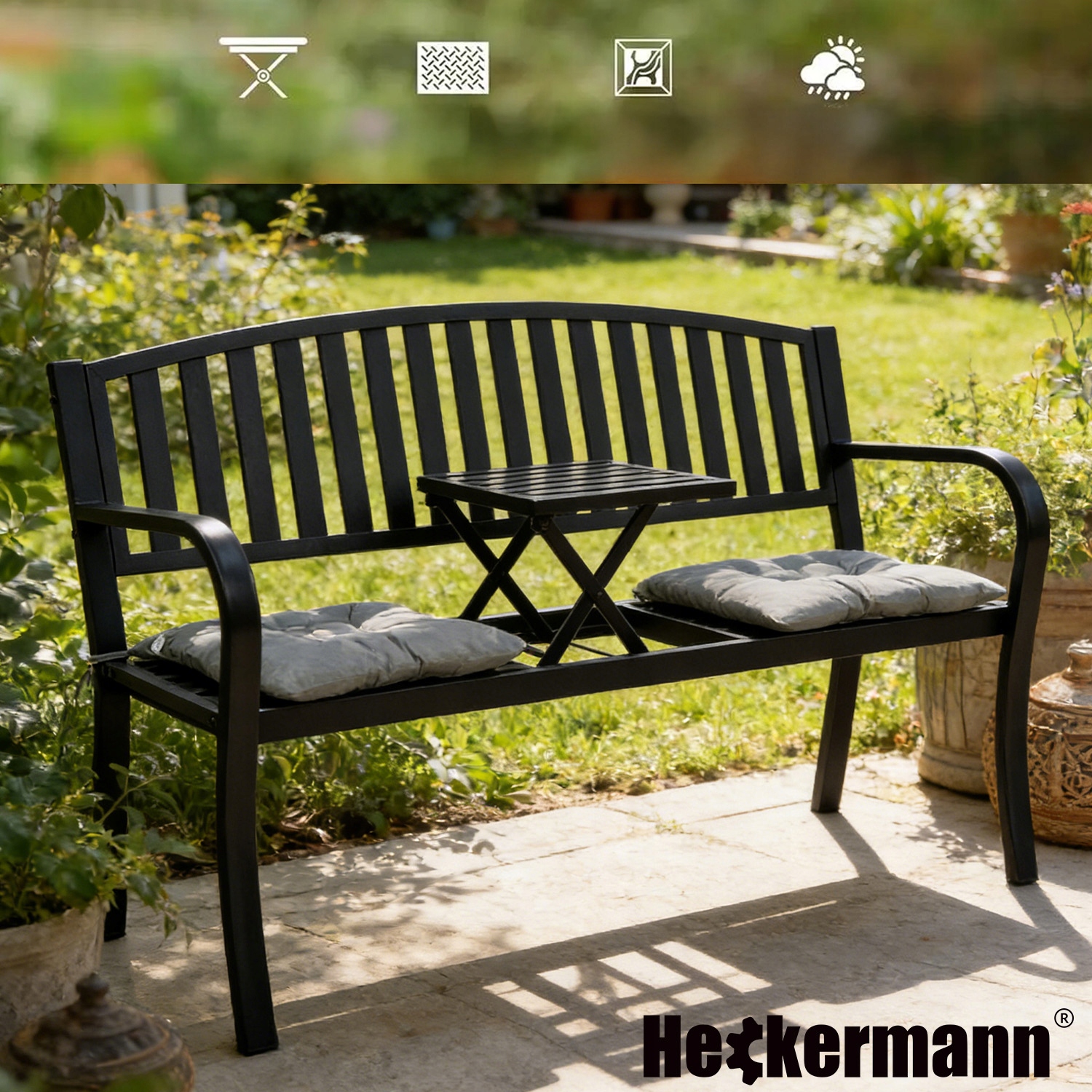 Ławka ogrodowa Heckermann z wysuwanym do góry stolikiem – wygoda, której naprawdę brakuje w ogrodzie!