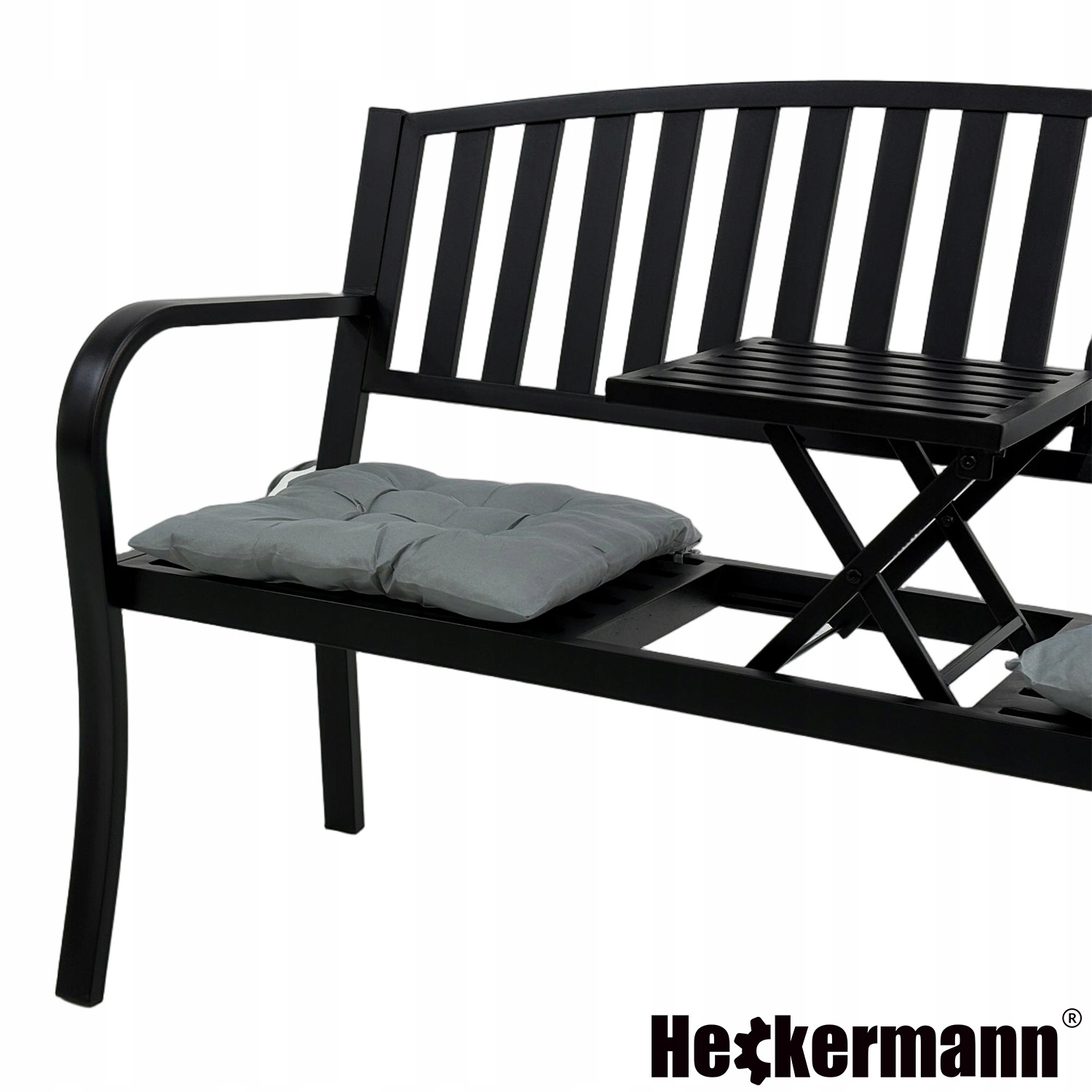 Wygodna ławka ławeczka ogrodowa z wysuwanym stolikiem metalowym + 2 poduszki